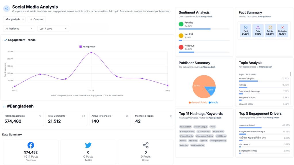 Track and analyze public conversation from Facebook, X (Twitter), YouTube, News Sites, Blogs, and Forums through multilingual pipelines (Bangla, English, Malay, others).